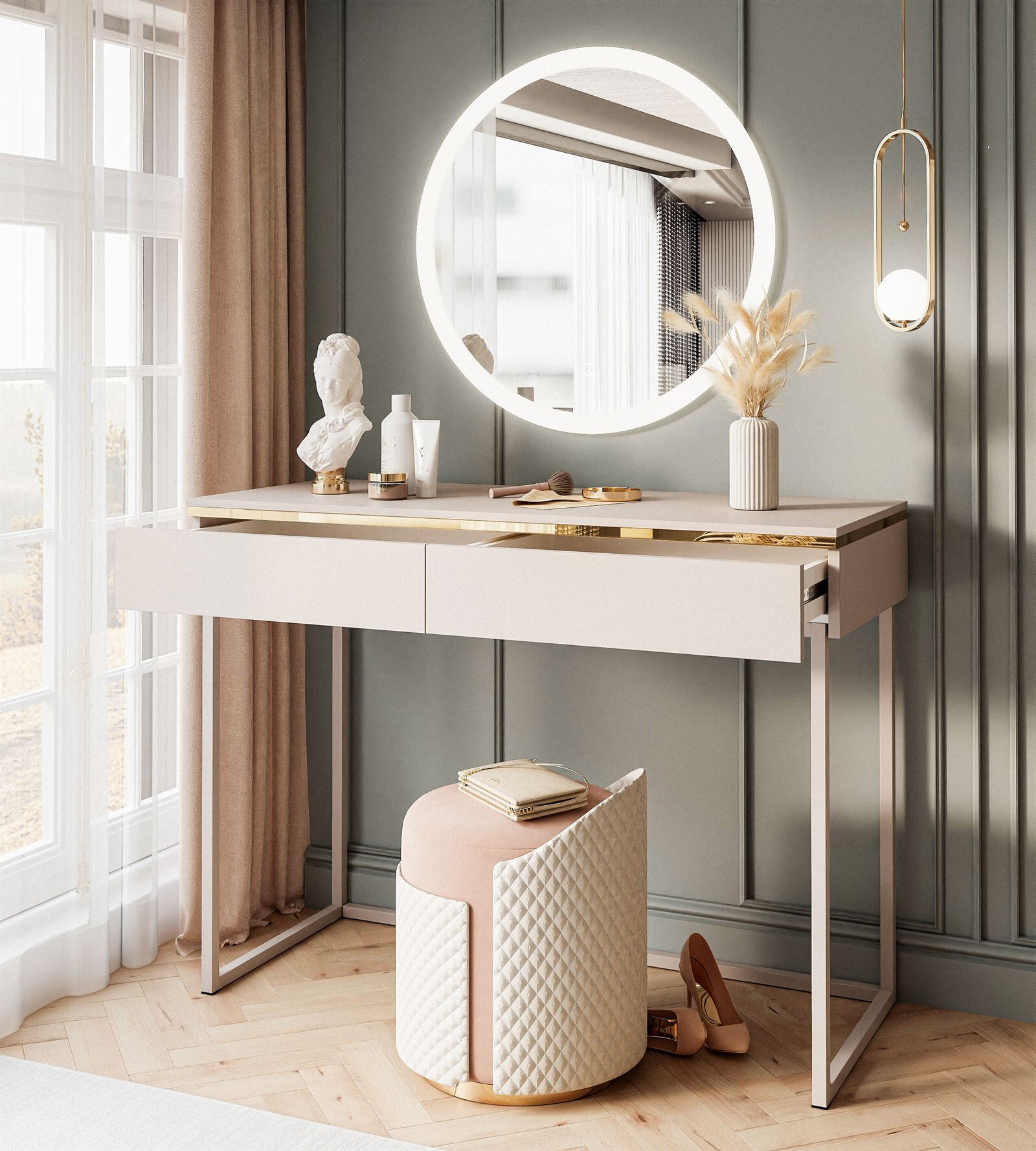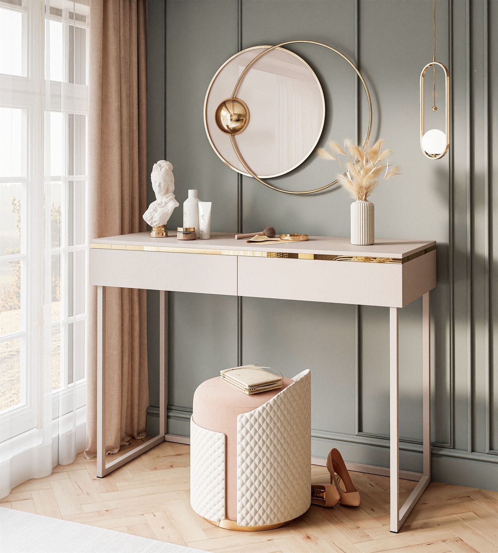 Der LOOKWAY Schminktisch AURORA II ELITE KASCHMIR kombiniert minimalistische Ästhetik mit luxuriösem Design. Durch seine schlichten Linien und zarten goldenen Akzente fügt sich der Tisch harmonisch in moderne Wohnräume ein.
